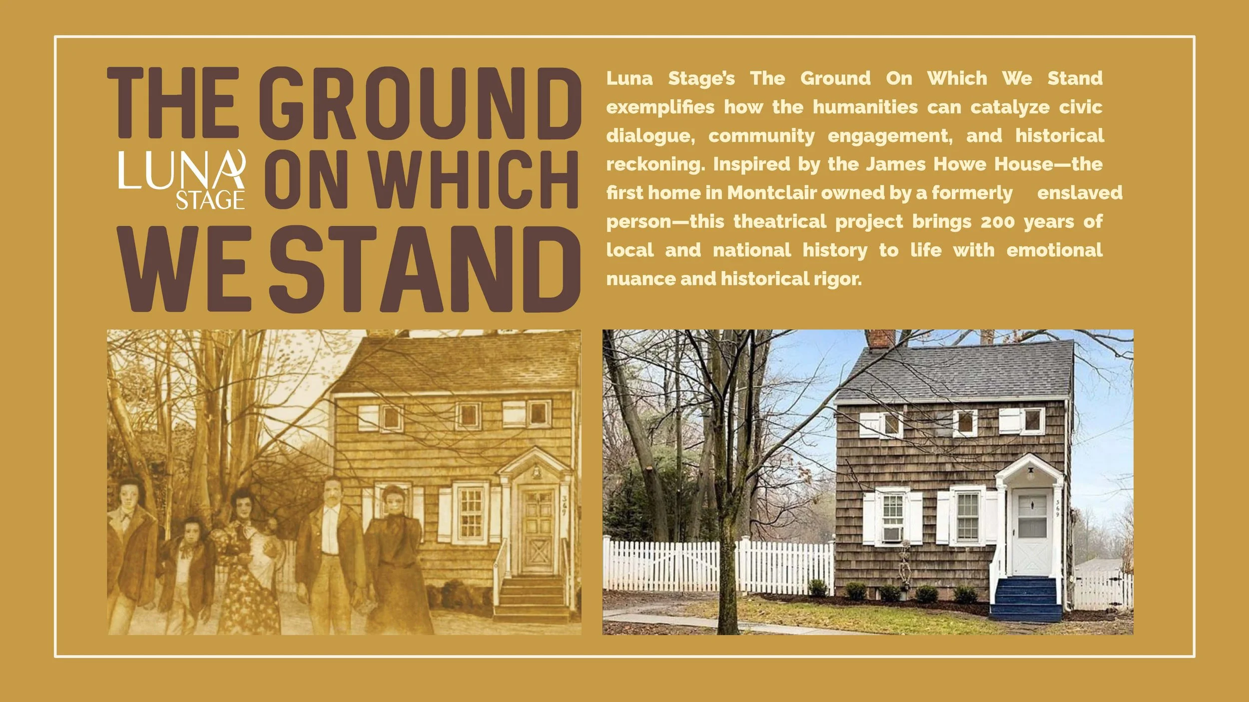 Inspired by the history and legacy of The James Howe House, the first home in the Township of Montclair to be owned by a formerly enslaved person, The Ground On Which We Stand interweaves diverse historic and contemporary voices and honors African American history and its role in shaping our future. The play spans 190 years, reflecting post-emancipation struggles, abolitionist history, the role of Black soldiers in the Civil War, the impact of de facto segregation past and present, and the way a community can come together to reckon with its past and make intentional choices to preserve and honor historic spaces.